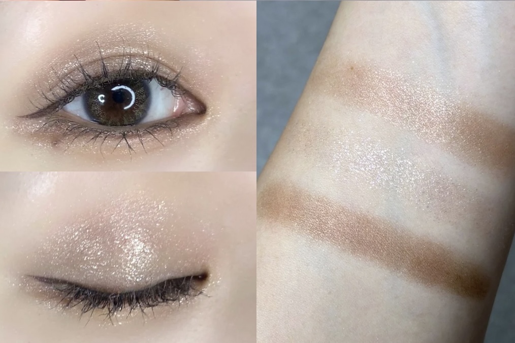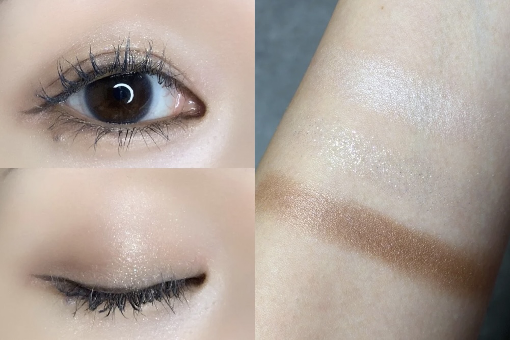 ミュートなマットカラーで影を作り、クリアなグリッターで奥行きを足す構成だから、派手さはないのに、目元にしっかり印象づけられる計算された配色なのがさすが!